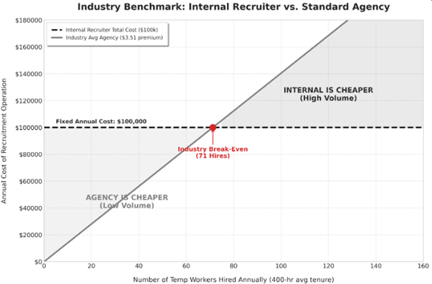 (The Agency Zone): For any company hiring fewer than 71 temp workers annually (approx. 6 per month), outsourcing to an agency is mathematically cheaper. The "premium" paid to the agency is lower than the fixed $100k overhead of an internal team.